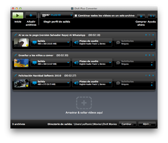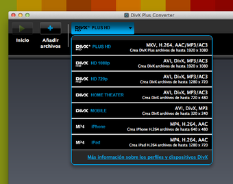 DivX Plus Converter te ayudará a convertir vídeos a los formatos AVI, DIVX, MKV y MP4, configurando al máximo las características de la conversión, como tamaño del archivo, resolución, tasa de bits, etc. Además, permite combinar varios vídeos en uno, añadir subtítulos y varios canales de audio.